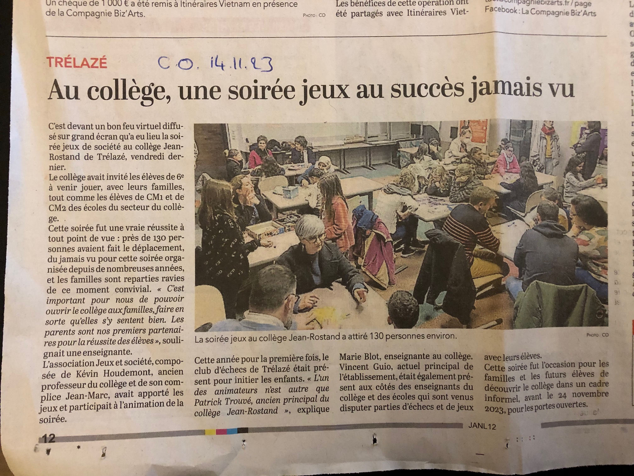 Télécharger l'image jpgArticle Courrier de l'Ouest 14 novembre 2023 - Soirée jeux au collège Jean Rostand
